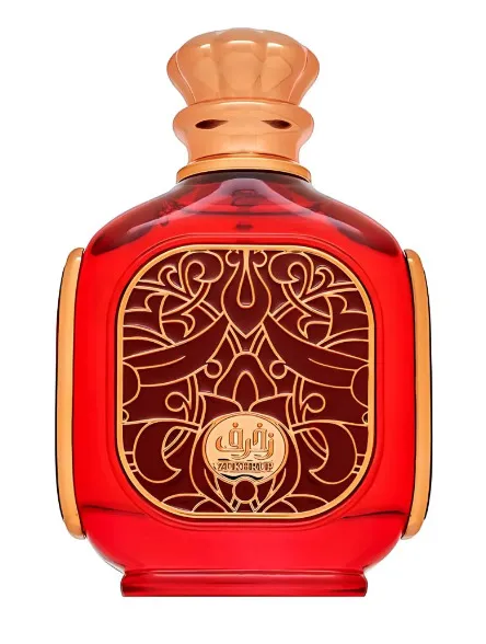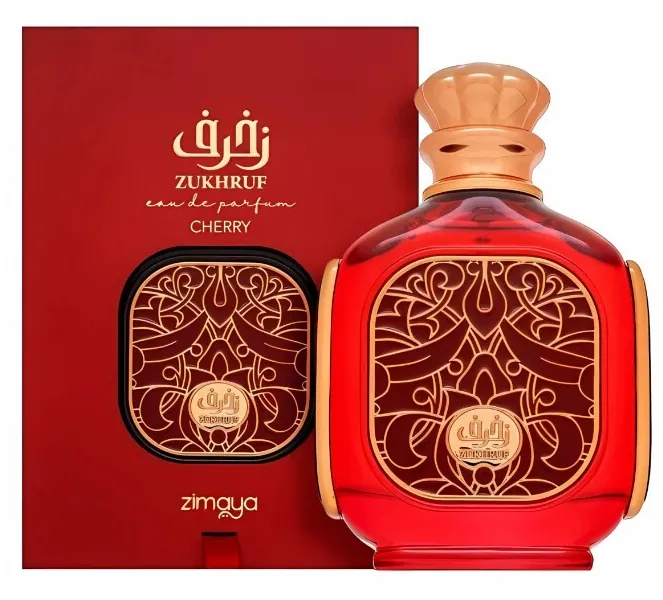 Zukhruf Cherry - EDP, 100 ml — a captivating unisex fragrance that opens with the rich sweetness of black cherry and almond, leading to a heart of cherry, plum, and jasmine. The base notes of tonka bean, vanilla, sandalwood, and cedar provide a warm, lingering finish. Launched in 2024, Zukhruf Cherry is a Floral Fruity Gourmand scent.
